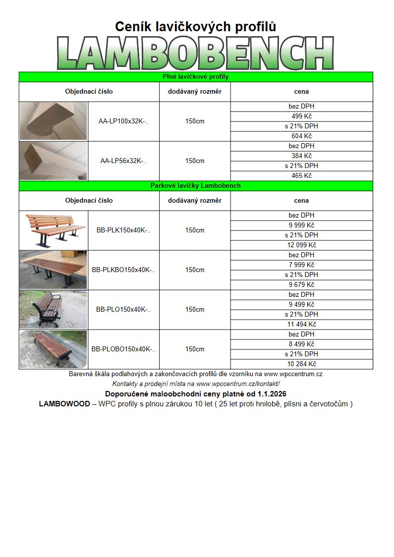 Ceník WPC lavičkových profilů a laviček Lambobench od 1.1.2026